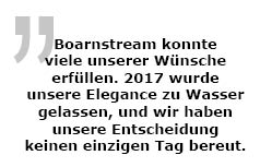 geklickt. Wir fanden einige Leute von Werften mit schönen Schiffen arrogant. Andere Werften hatten eine schöne Reihe von Schiffen, aber nicht unter 15 Metern. Außerdem konnte Boarnstream viele unserer Wünsche erfüllen. 2017 ging unsere Elegance zu Wasser und wir haben unsere Entscheidung keinen einzigen Tag bereut.“