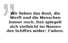 ist, das Boot ist sehr solide und fühlt sich sicher an, und der Multiknick-Rumpf verleiht ihm ein klassisches Aussehen. Dieses Boot bleibt klassisch und wird nie altmodisch.” Priska fügt hinzu: “Wir lieben das Boot, die Werft und die Menschen immer noch. Das spiegelt sich vielleicht im Namen des Schiffes wider: J’adore.”