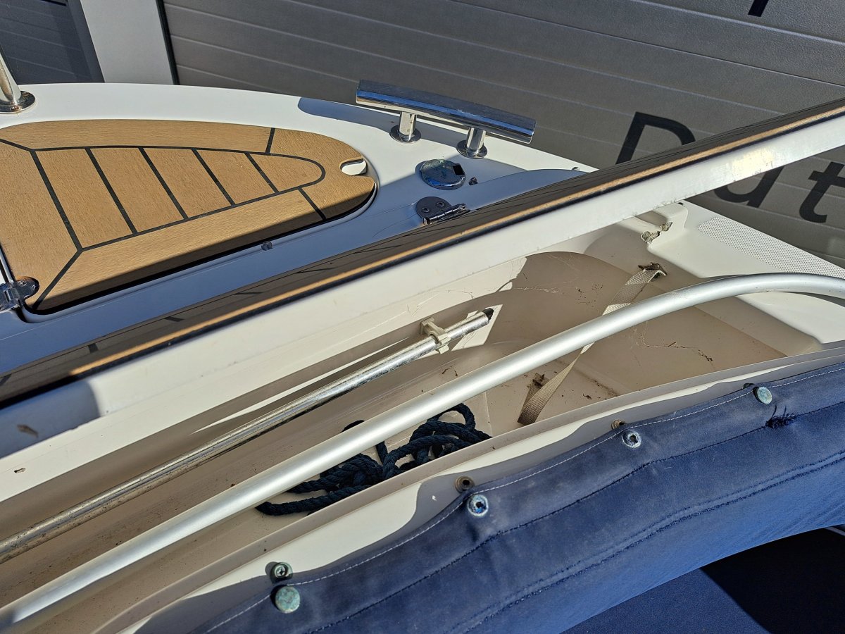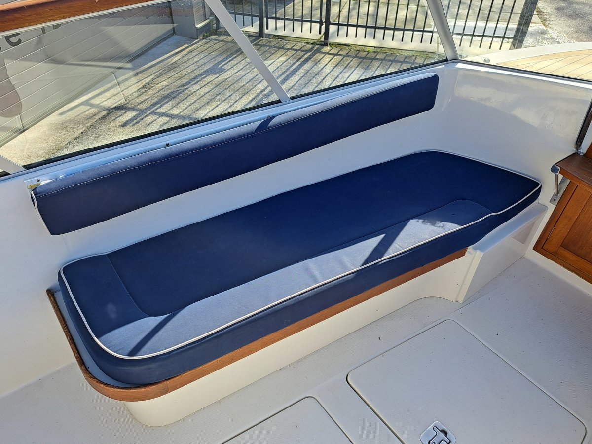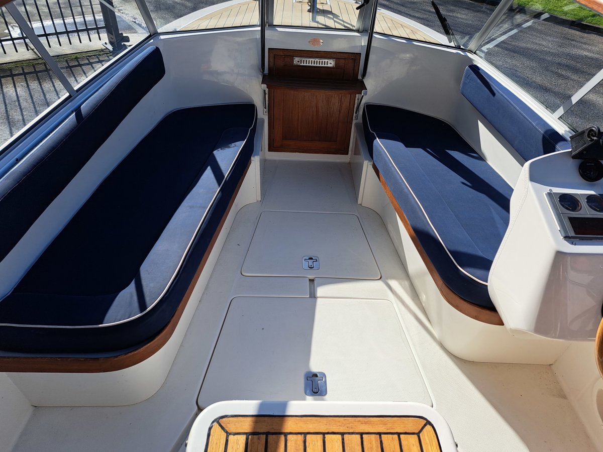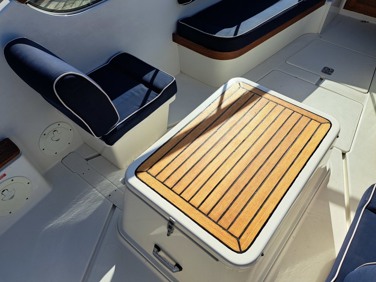Schöne, gepflegte Schaluppe mit viel mehr Funktionen als die durchschnittliche Schaluppe. Zum Beispiel kann das Boot durch ein komplettes Zelt verschlossen werden und dank des Glaswindschutzes mit Scheibenwischer kann es trotzdem gesegelt werden, ohne die Sicht zu beeinträchtigen. Ideal, wenn das Wetter umschlägt. Das Cockpit ist selbstlenzend und bietet viel Stauraum, auch unter den Bänken und im Vorschiff. Es gibt einen Doppelsteuerstand; die Steuerung kann mit einer Pinne oder über die hydraulische Steuerung auf der Steuerbordseite erfolgen. Die Spritzdecke wurde 2019 ausgetauscht, 2023 erhielt das Boot ein komplett neues synthetisches Teakdeck, und im Februar 2025 wurde die Spritzdecke erneut gereinigt und komplett imprägniert, wobei im März 2025 auch eine Motorwartung durchgeführt wurde. Der fast neue 2-achsige gebremste Benderup Bootstrailer kann gegen Aufpreis übernommen werden (Preisvorstellung 38.950 €).