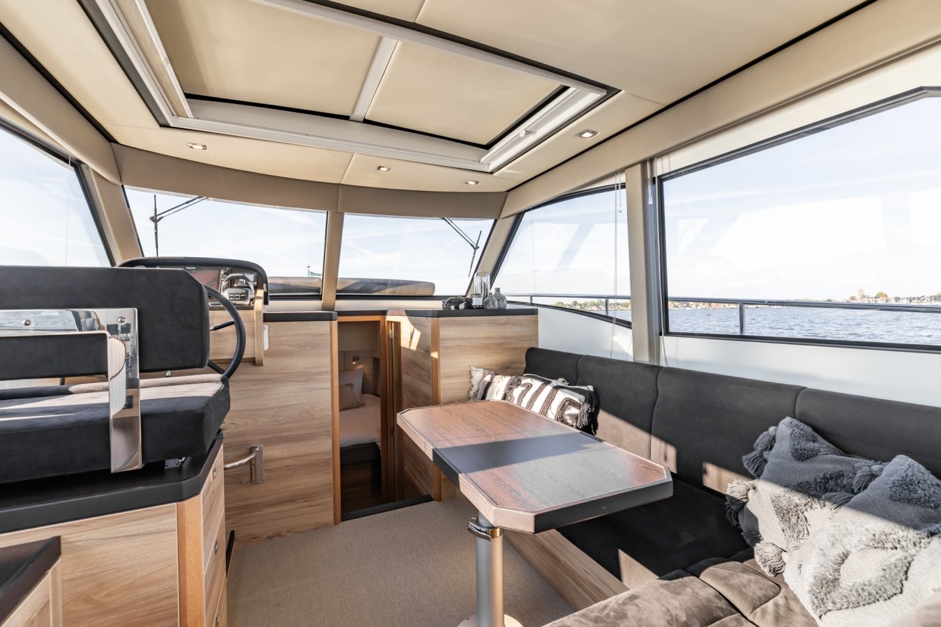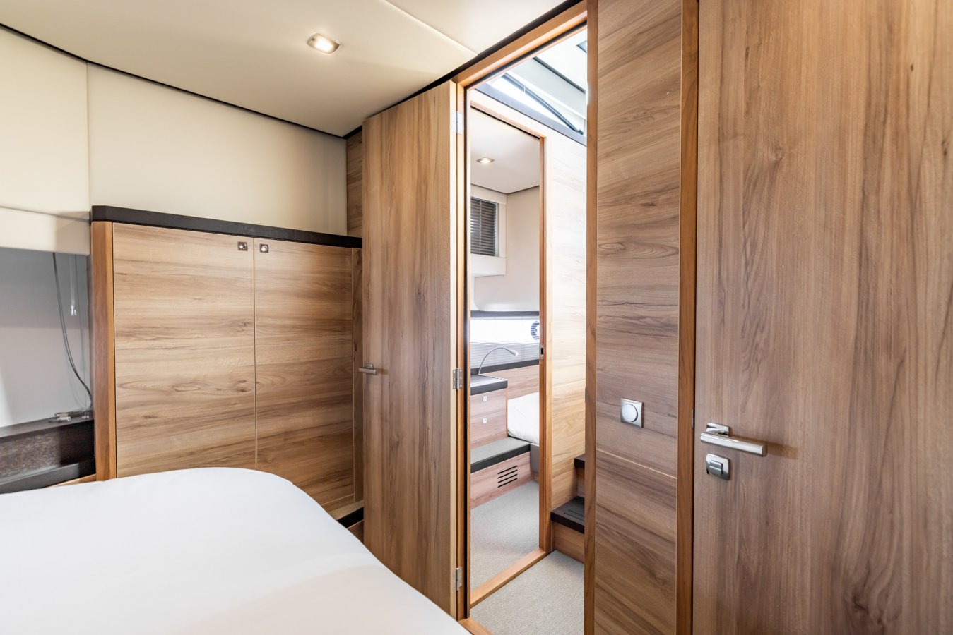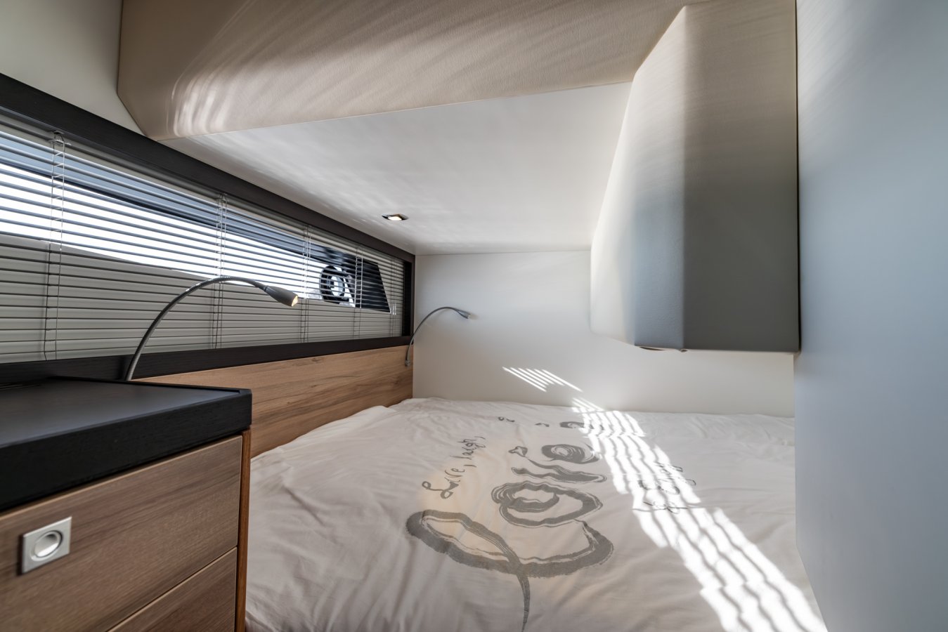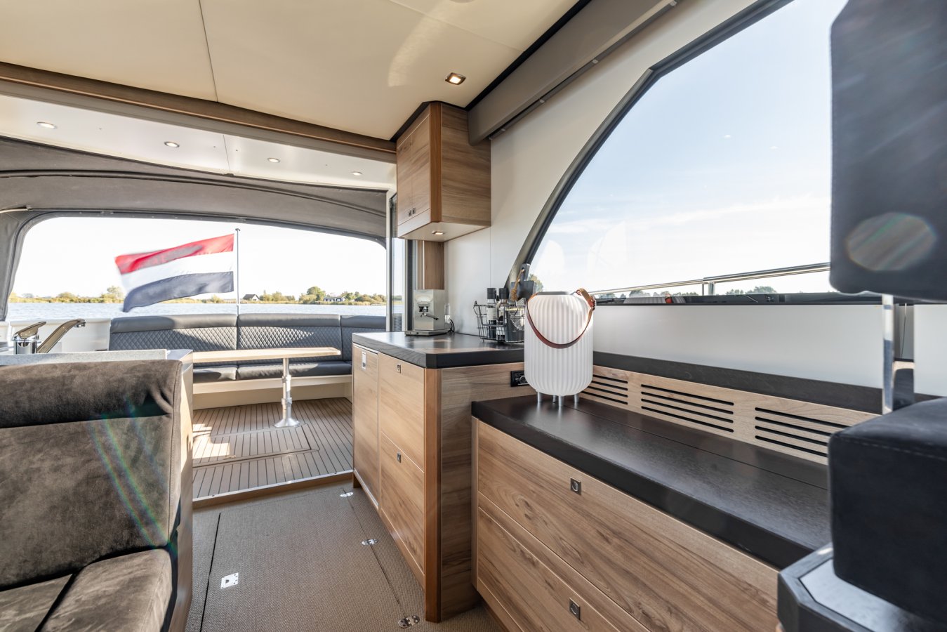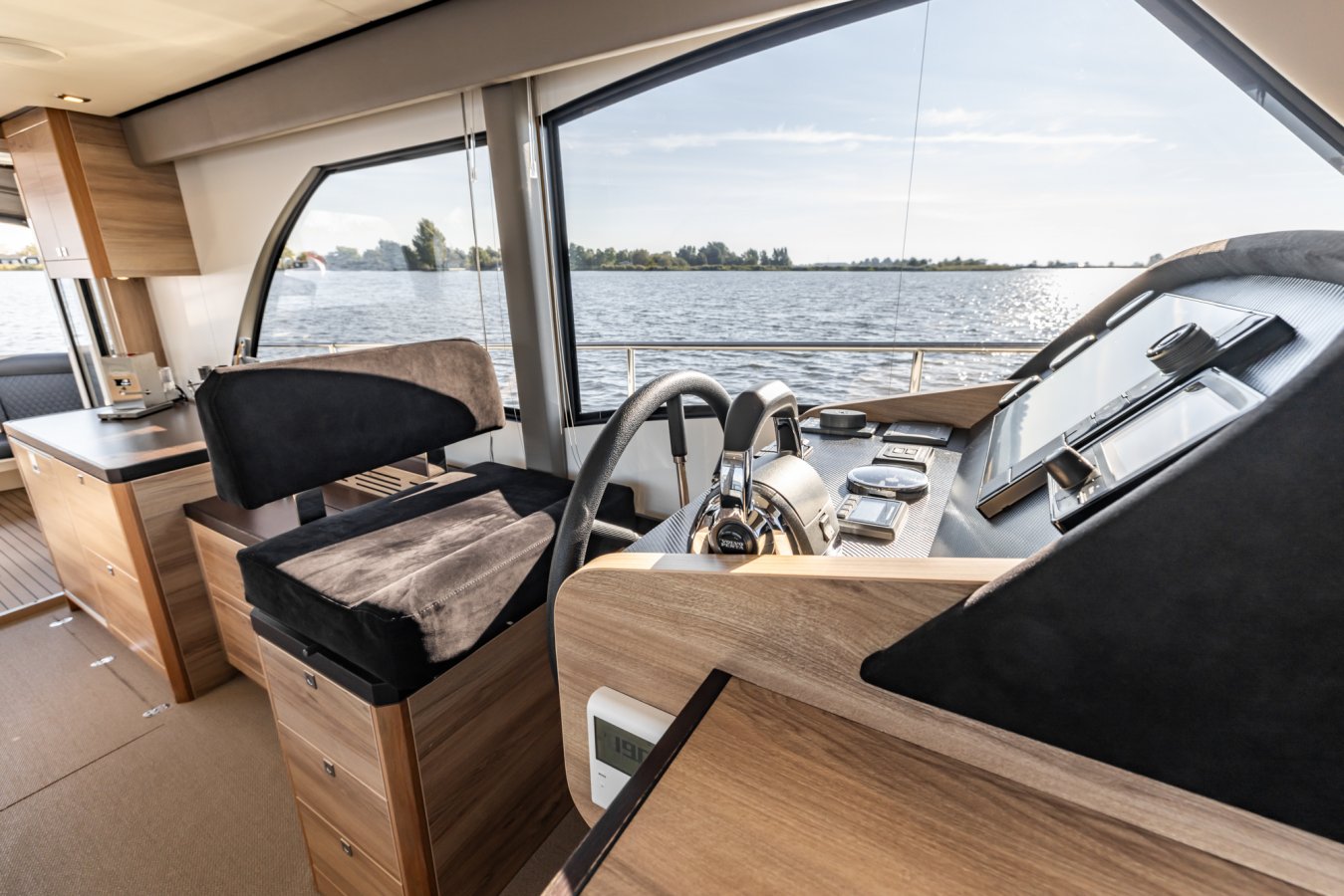 Gebogen frontramen, ramen grijs getint zonwerend securit glas. Panorama-ramen in slaapkabines (acrylaat). Patrijspoorten klapbaar: 5 x. Voorste salon ramen voorzien van een zonwerende 'cover'