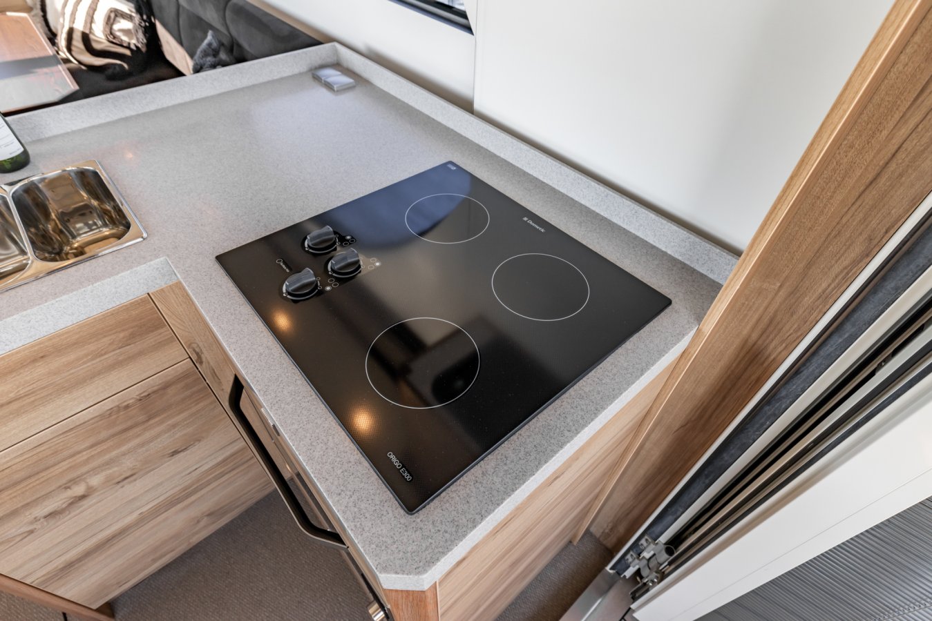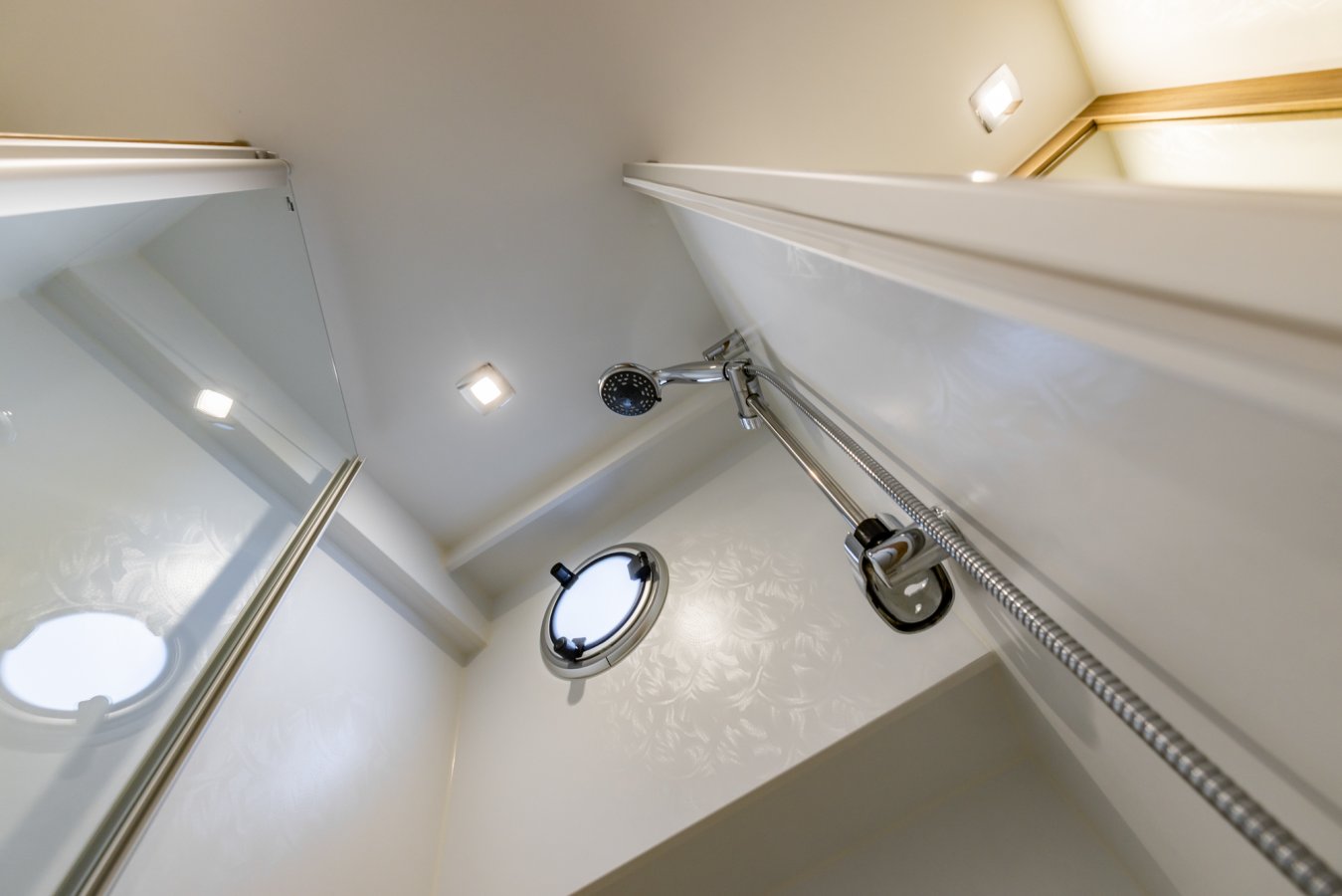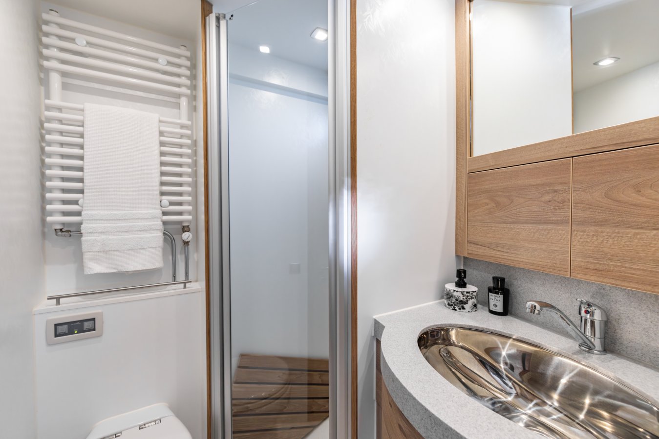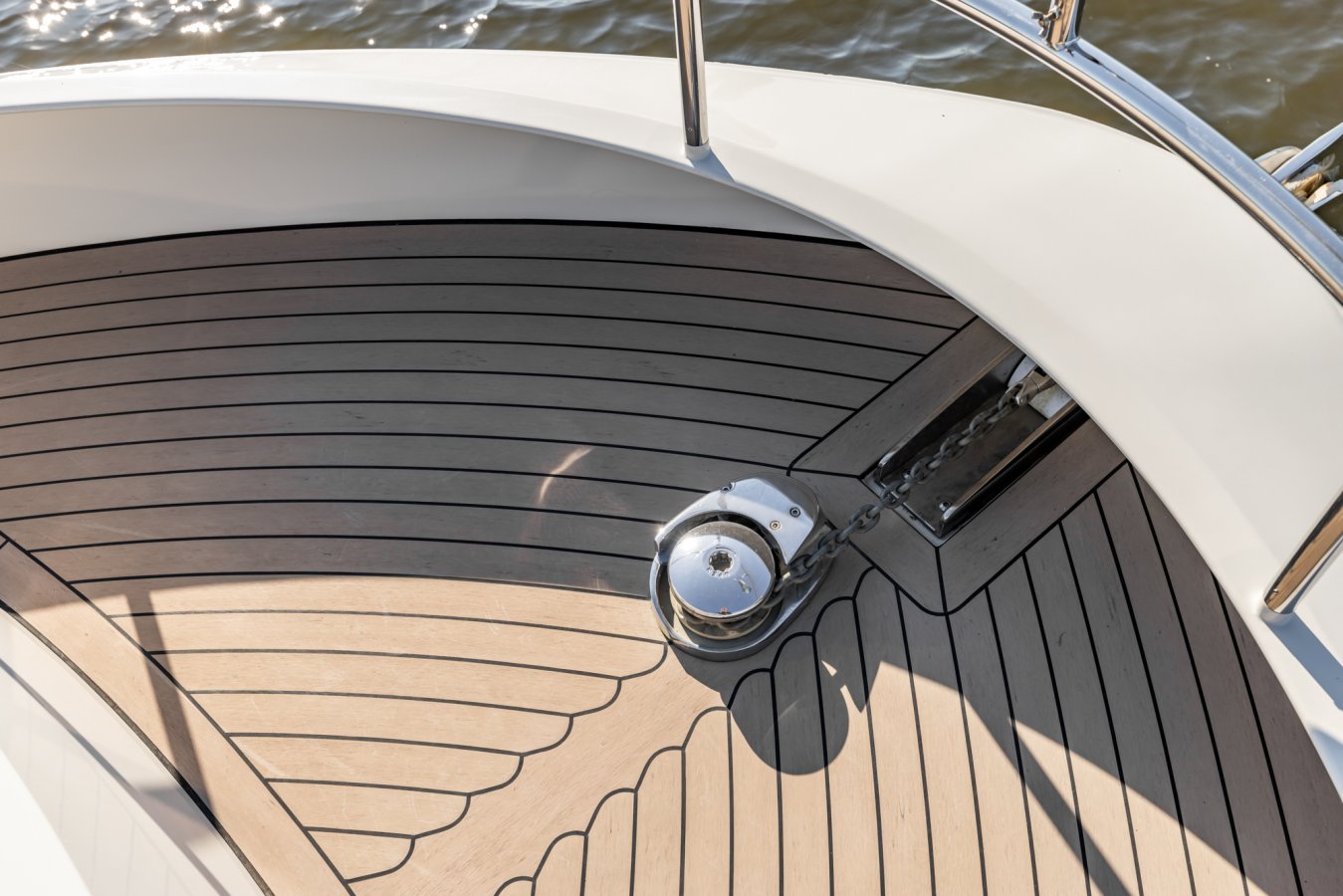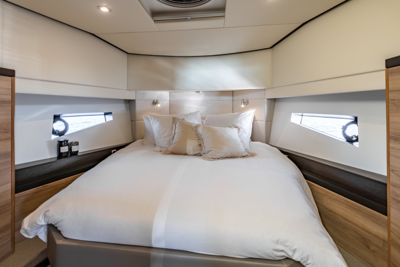 Gebogen frontramen, ramen grijs getint zonwerend securit glas. Panorama-ramen in slaapkabines (acrylaat). Patrijspoorten klapbaar: 5 x. Voorste salon ramen voorzien van een zonwerende 'cover'