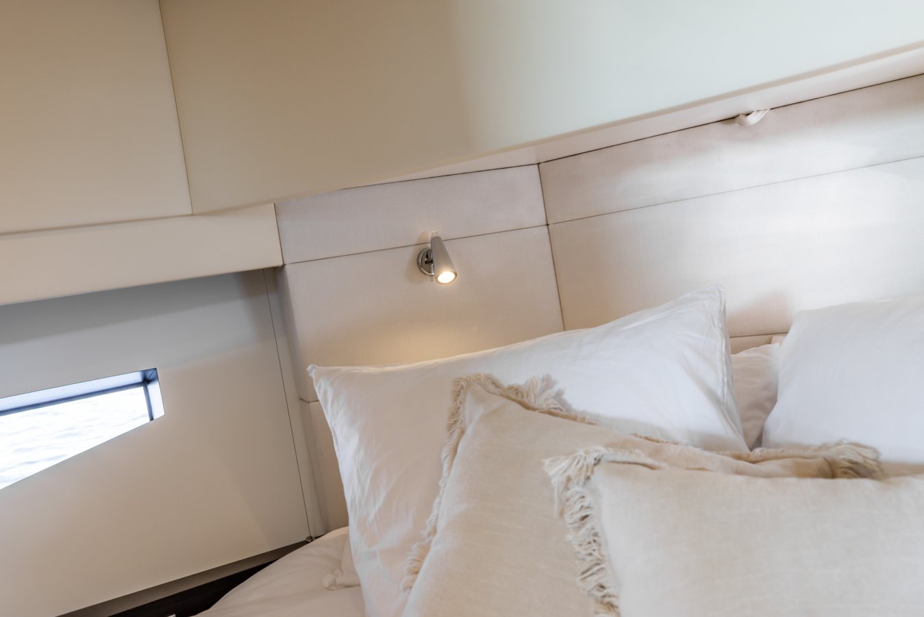2 luxe zonnedek kussens met afritsbare nekrol, voorzien van Silverquard bekleding met diamant stiksels. Uitgevoerd met magneten voor gemakkelijke montage op het voordek.