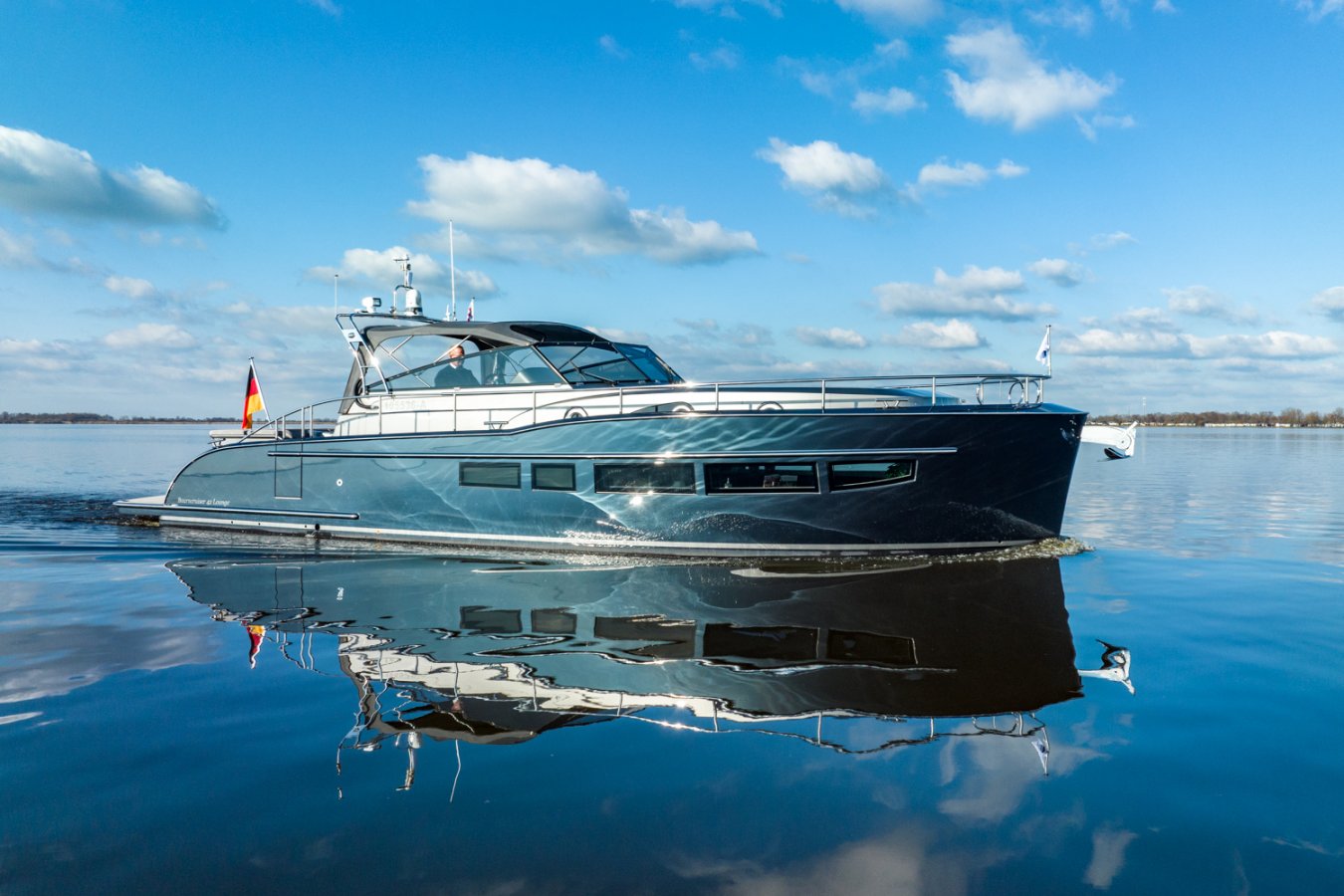 - Zowel de romp, opbouw als binnenzijde kuip met kuipmeubel volledig in de metallic lak gespoten (Alexseal Porsch Nautic Metallic / Stardust Silver Metallic)