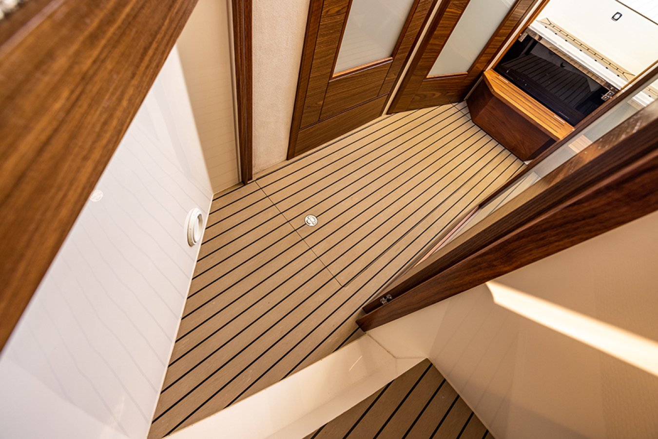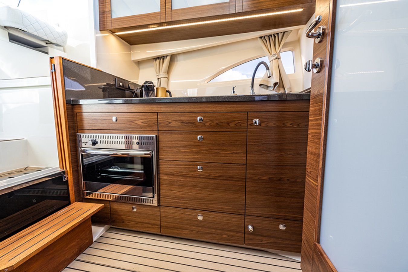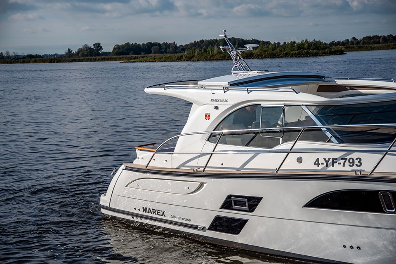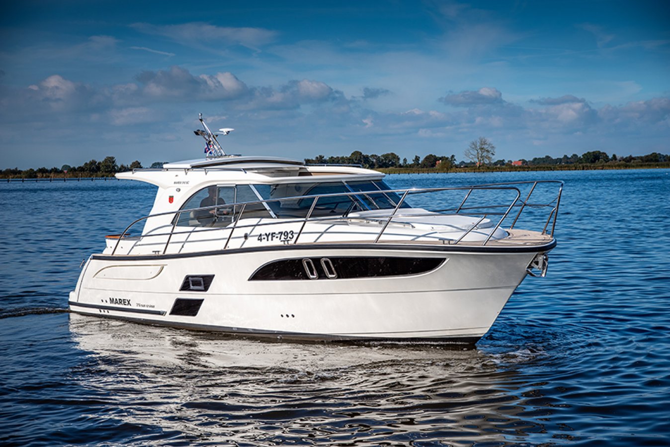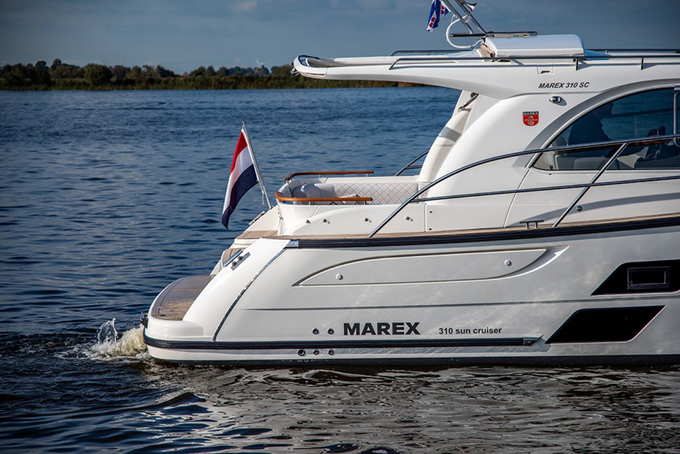 A very stylish Marex 310 Sun Cruiser, equipped with a Volvo Penta D4-320 DPI. This is a very well equipped and well maintained boat. Unique to this Marex 310 Sun Cruiser is that she is completely covered with flexiteek in the color Weathered. This combined with the walnut paneling and her light cushions, makes this Marex 310 Sun Cruiser a fresh but also unique appearance!