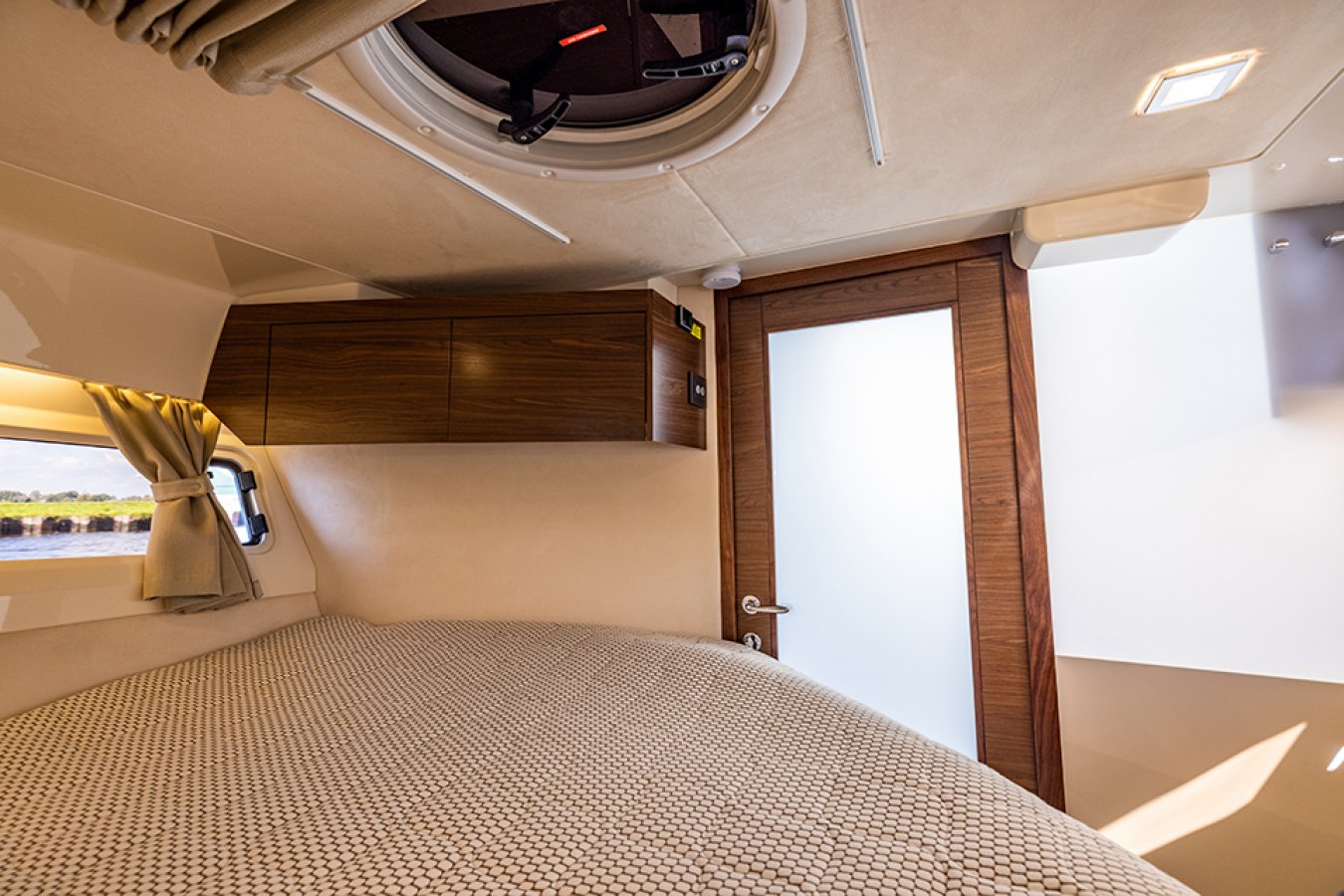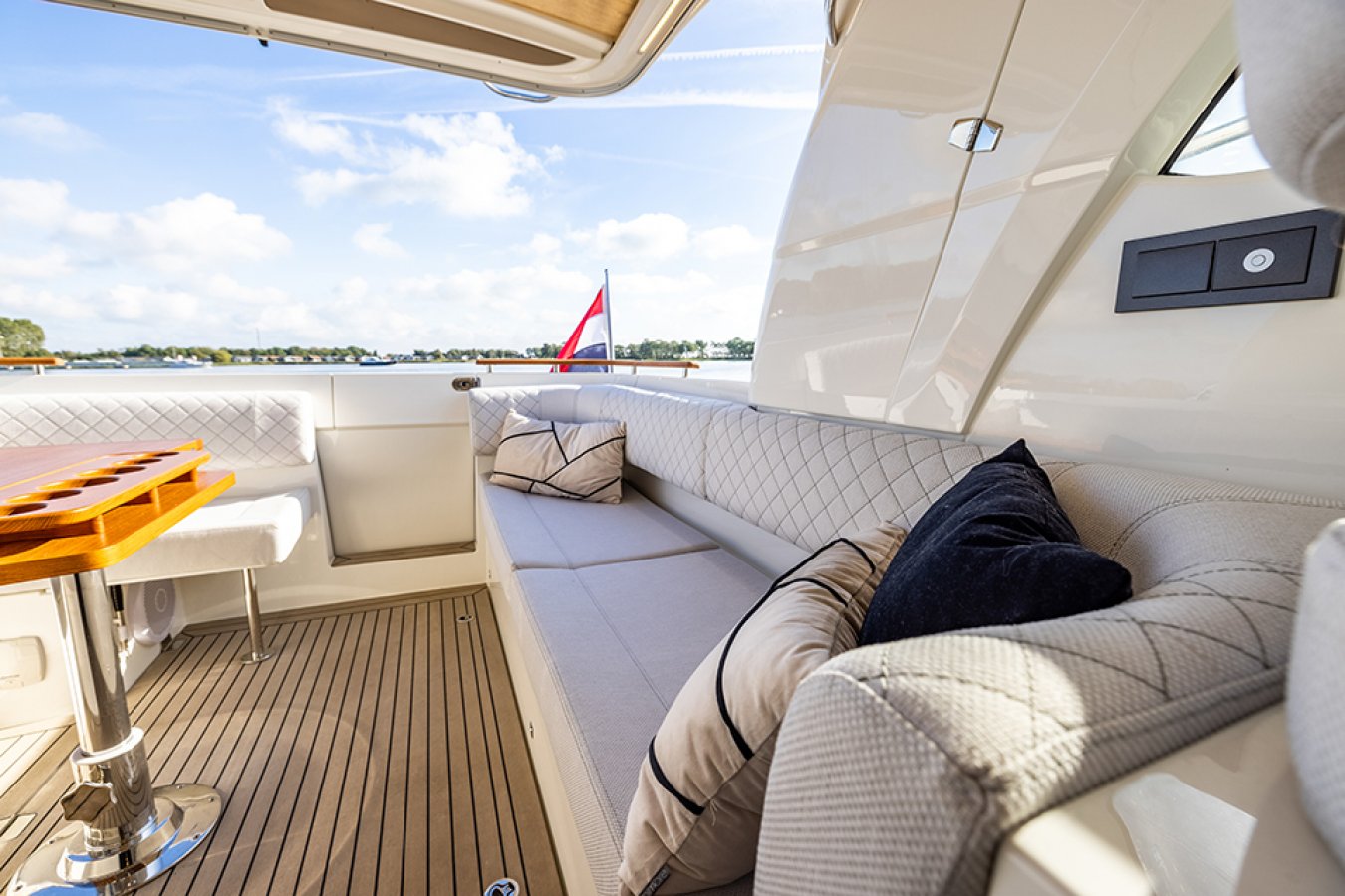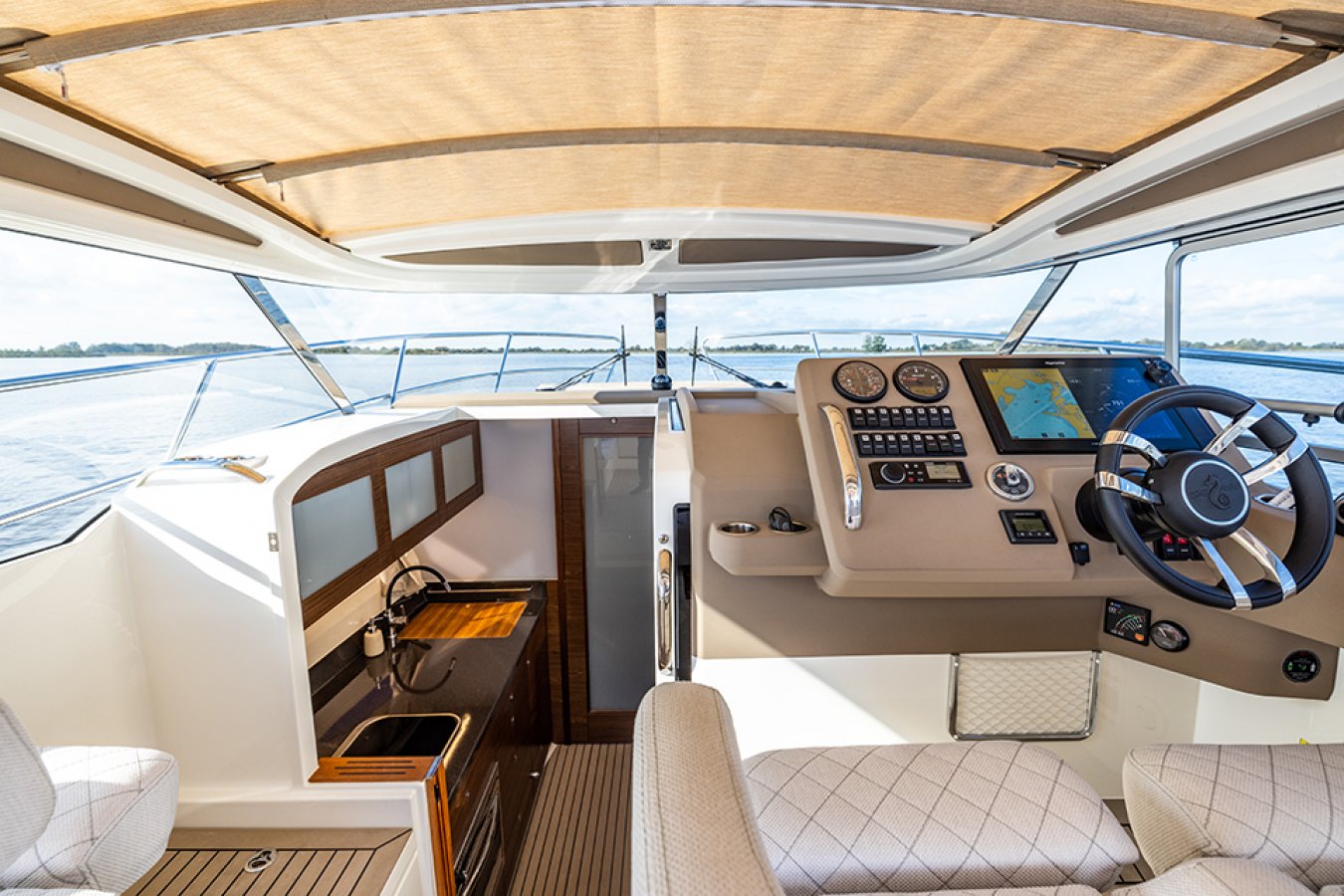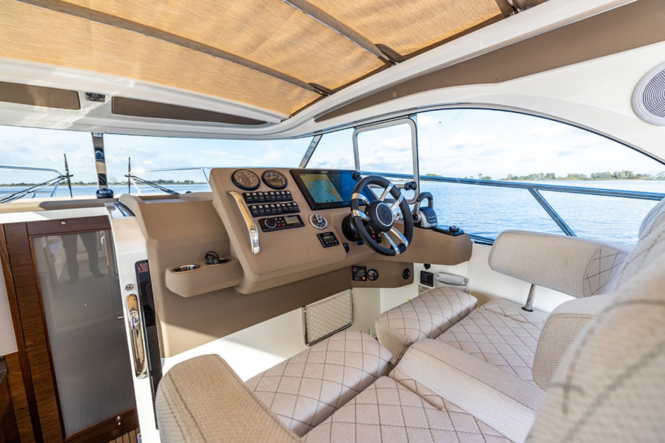 The exterior with her black bumper, blinded windows, beige cockpit tent and the combined sun deck cover make this Marex 310 Sun Cruiser a tough yet stylish combination.