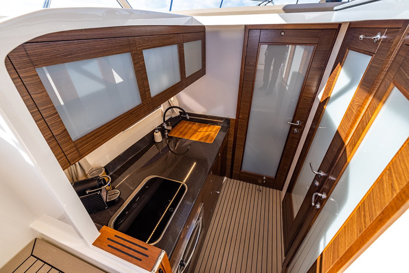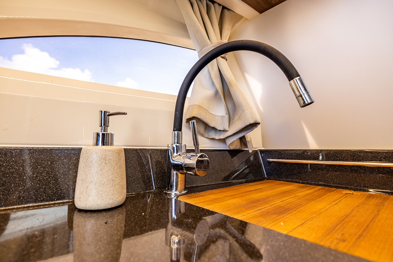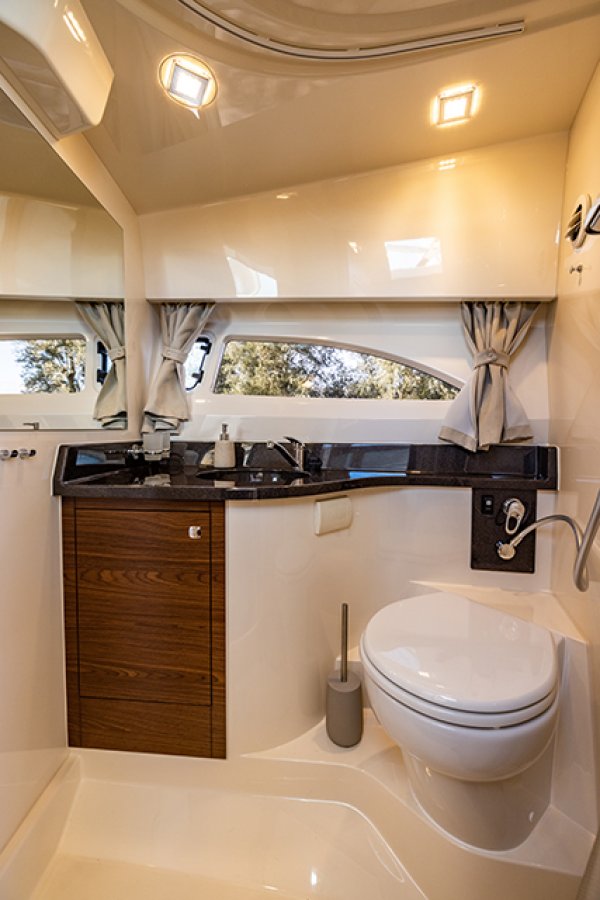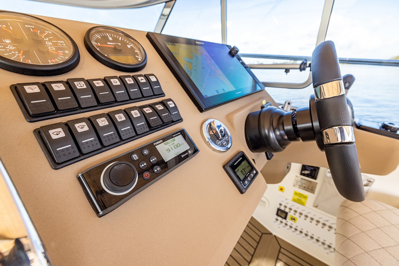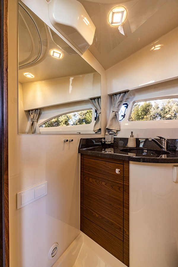 The exterior with her black bumper, blinded windows, beige cockpit tent and the combined sun deck cover make this Marex 310 Sun Cruiser a tough yet stylish combination.